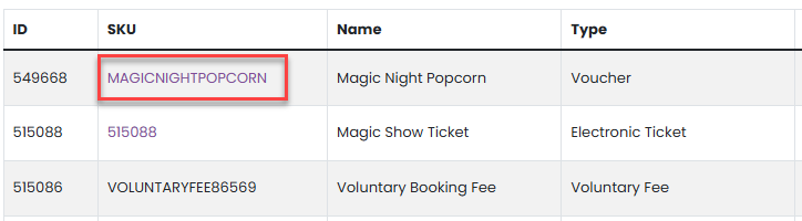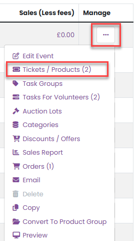 From the event management menu next to the relevant event, select Tickets/Products.