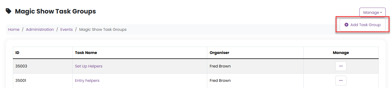 Once on the Task Groups management page, select Add Task Group from the Manage menu.