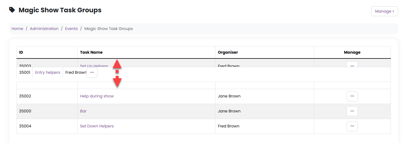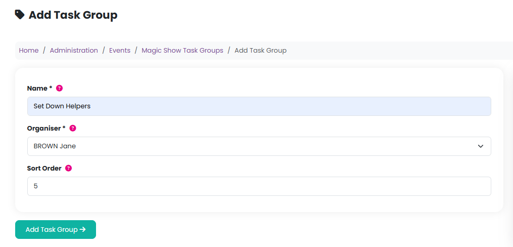 Task groups allow you to organise related tasks into logical collections, making event management simpler and more structured. For example, at a school circus you might create separate task groups for the BBQ, Bar, or Tuck Shop, with each group containing its own set of tasks.