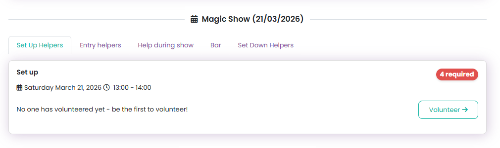 They are visible under Volunteers from the main navigation, on the event page, and during the checkout process, all in the same tabular format: