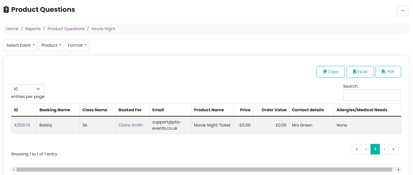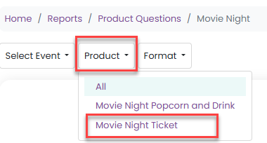 By default, the Product Questions report displays data for the most recent event set up on your PTA Events / Clubs Hub / Charity Hub website.