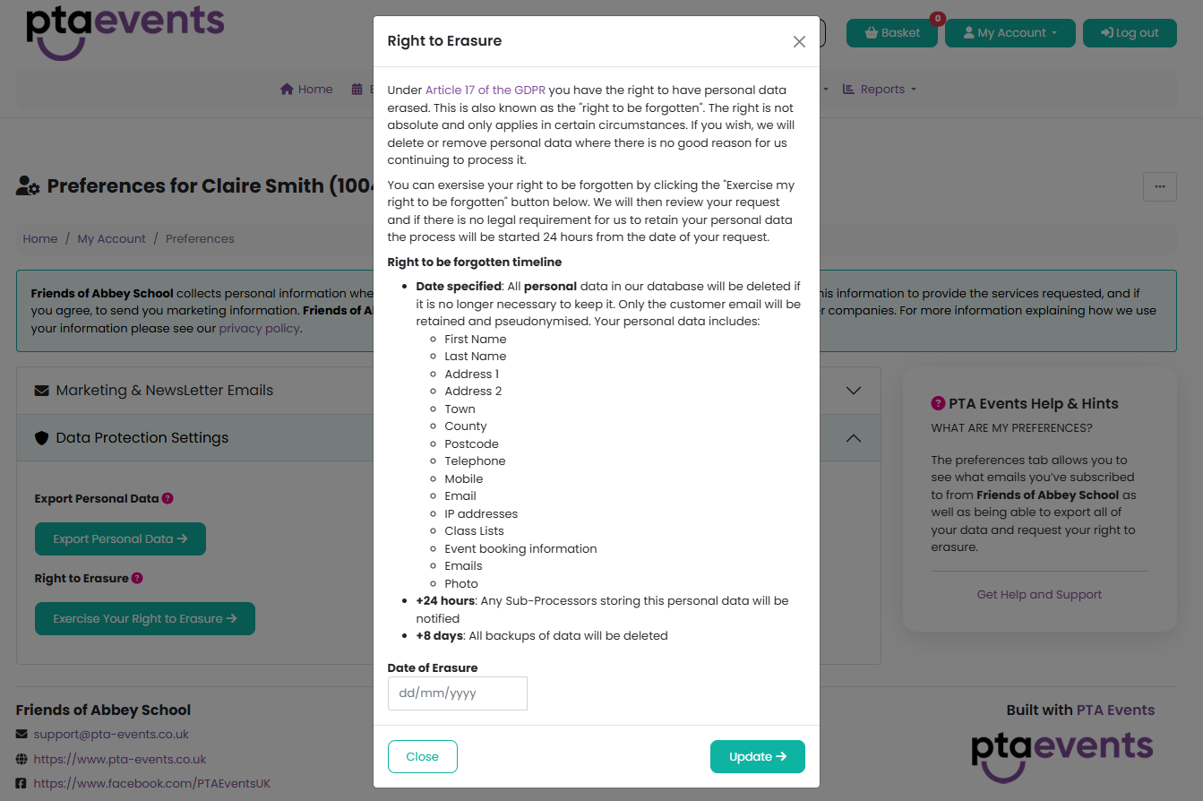 When you leave the organisation, you can exercise your right to erasure through your account settings. To do this, go to My Account > Preferences and select Exercise your right to erasure.
