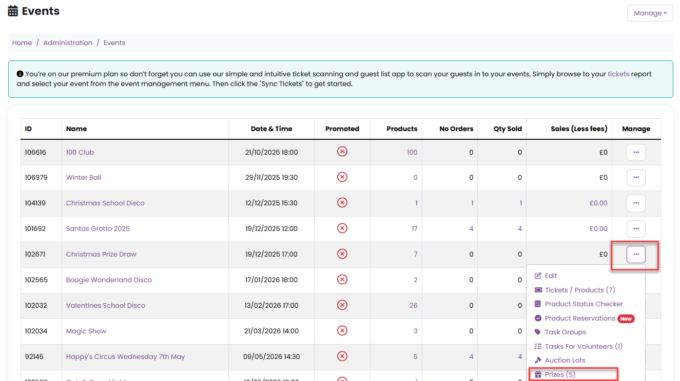Your prize draw event prizes admin page is located in the "Manage" menu of your event: