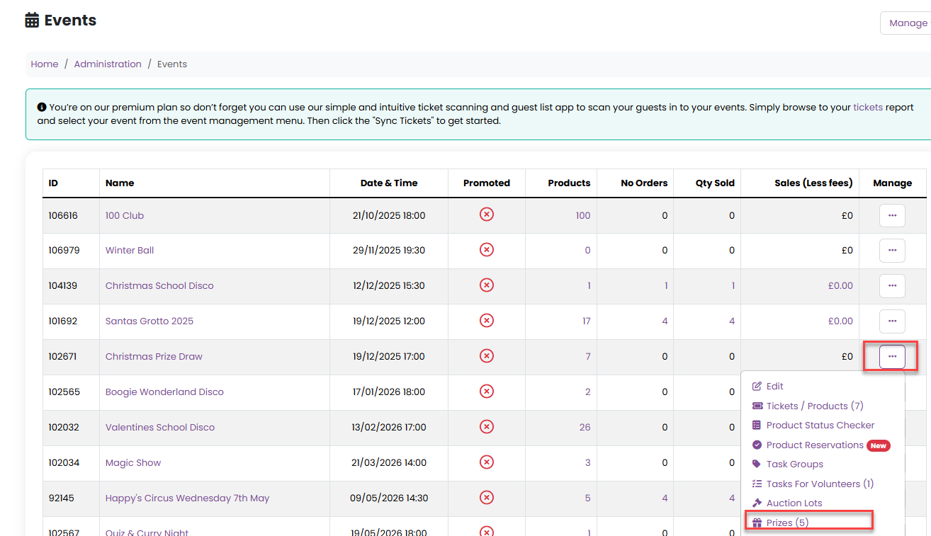 Head to "Admin" > "Events" and then select "Prizes" from the "Manage" menu for the relevant event: