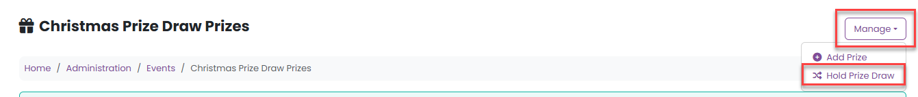 When you are ready to hold your Prize Draw (Online Raffle), the "Hold Raffle" button will be visible in the Prize Draw "Prizes" admin page in the "Manage" menu.