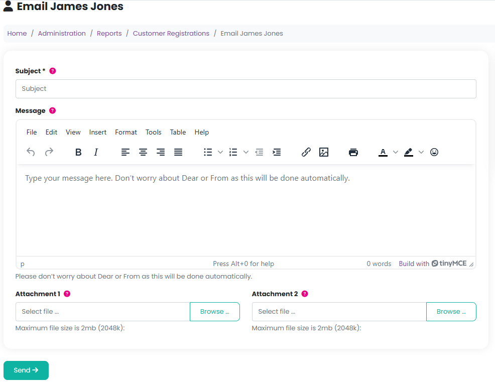 Enter a subject in the "Subject", and your message in the "Message" and you can add up to two attachments. Then click the "Send" button:
