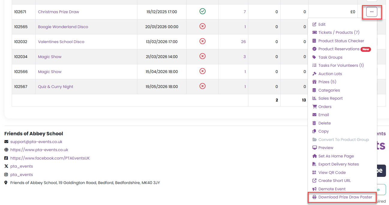 To access this, head to the event "Manage" menu and scroll down and select "Download Prize Draw Poster":