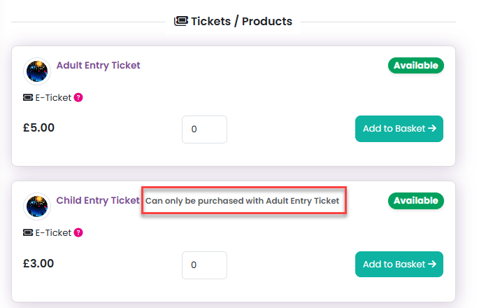 This option can be used, for example, when you are selling a child ticket that needs to have an adult ticket purchased with it.