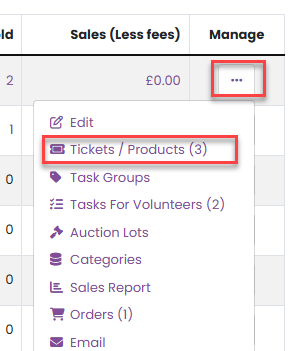 Once you have added your event you can then add tickets / products for sale by clicking "Tickets / Products" in your event management menu: