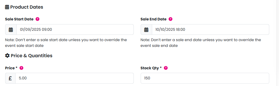 Enter the sale start date and time and the sale end date and time, and the price for your early bird tickets. Please note that these dates will override the dates entered at event level and this product will only show for sale during the dates and times entered: