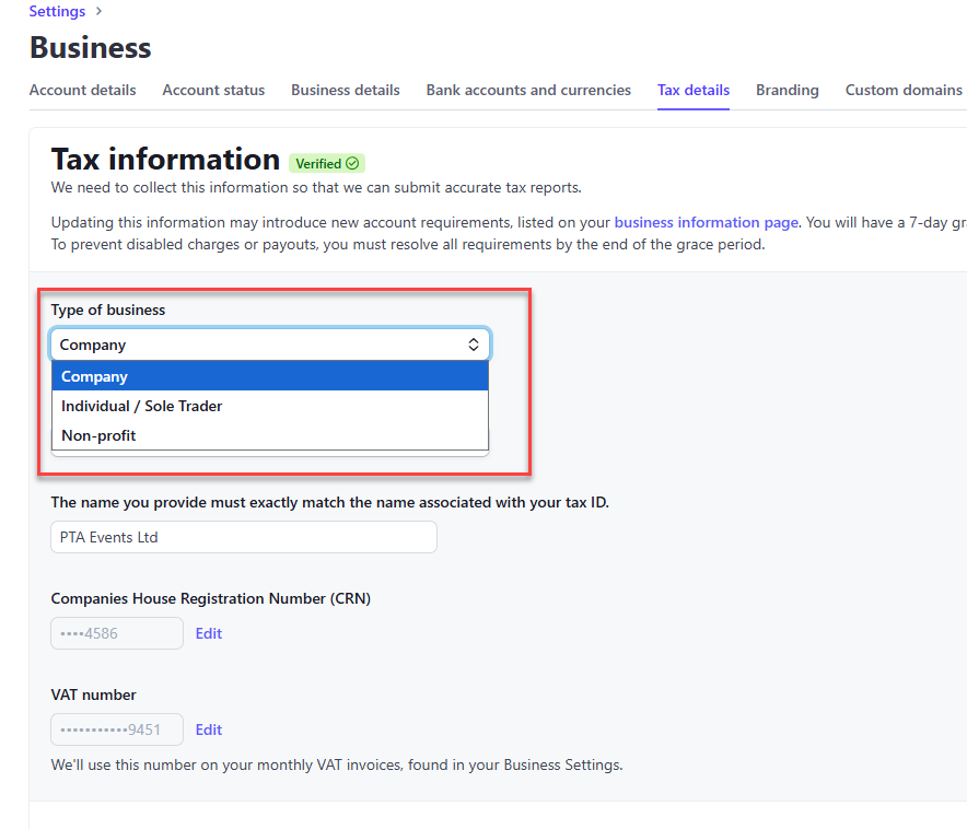 If your circumstances have changed or you entered the wrong business type when setting up your Stripe account, then please log in to your Stripe account and browse to: