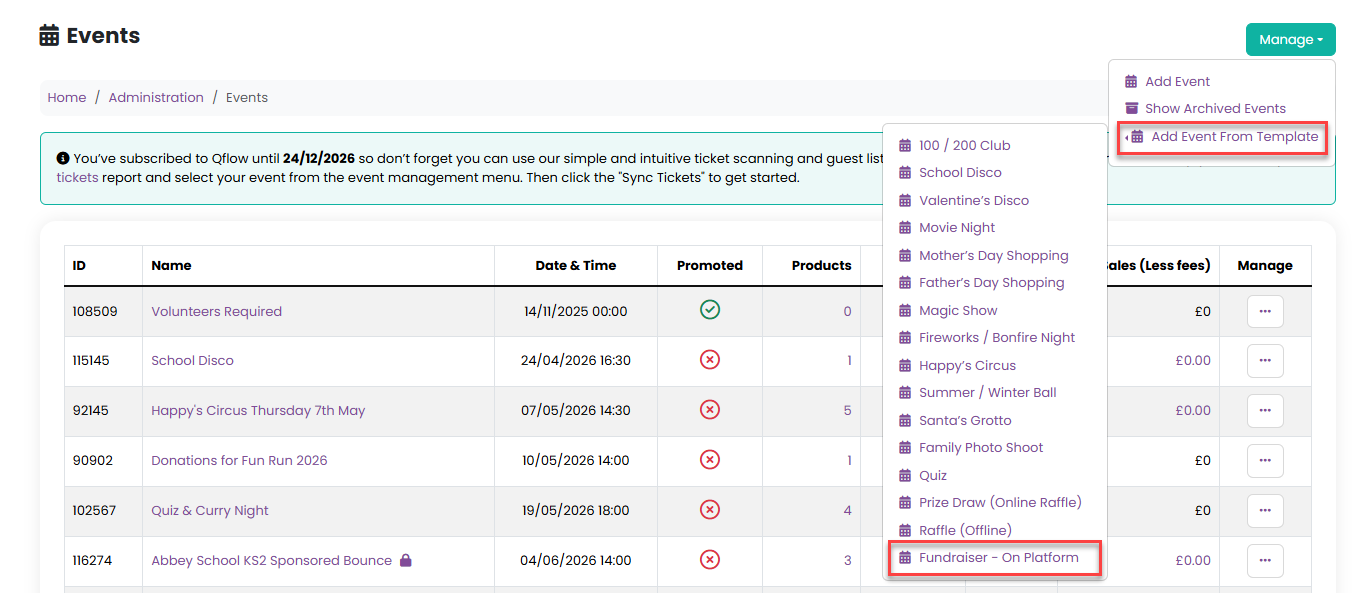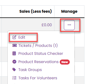 To make any changes or upload an event image, click on the event name or select Edit from the Manage menu.