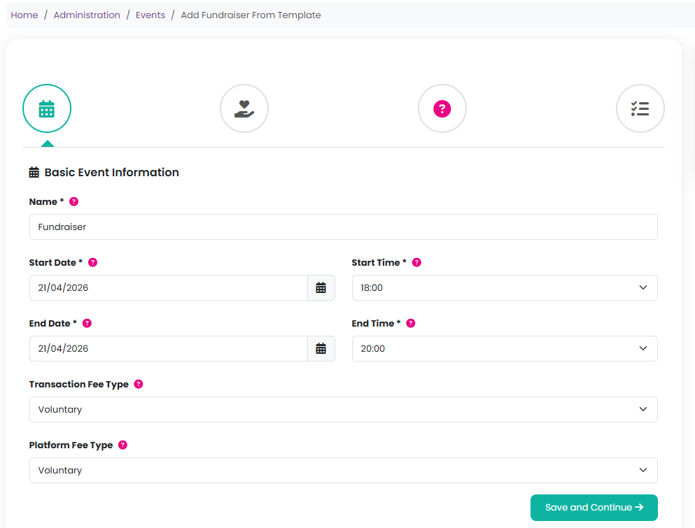 Key details such as the event name, dates, times, and fee types are pre-populated for you, but can be edited as necessary.