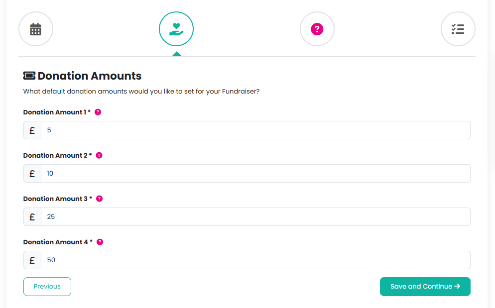 Set the default donations amounts for your Fundraiser. An optional amount box will also be created.