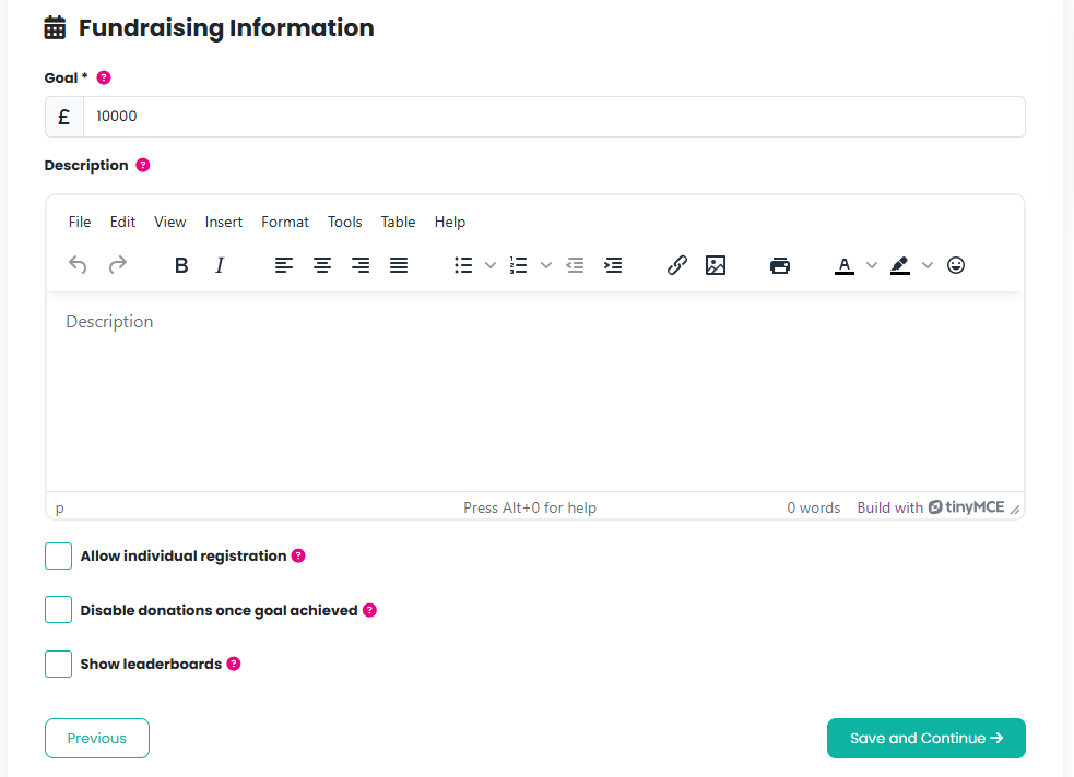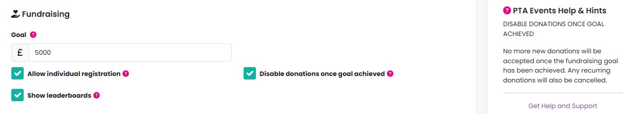 Enter the goal amount you are looking to achieve and a description of the event. Here you can check if you would like to allow individuals to register and have a unique fundraising link and QR code to share with family and friends. The amount raised will then be attributed to that individual child. You can also check if you would like leaderboards to show for class or group fundraising.