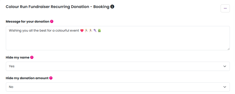 Product questions will automatically be created to allow your recurring and one-off donation customers to leave a message about their donation, show or hide their name and show or hide their donation amount during the process: